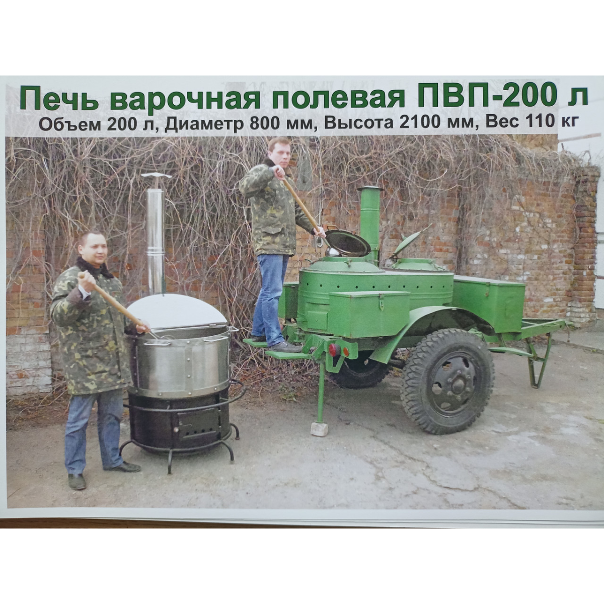 Приготування варених, тушкованих і смажених перших/других страв у великих обсягах на відкритому повітрі. Крім нержавіючого чана 200 літрів на піч можна встановити татарську сковороду Ф 800 мм, як додаткову опцію. Час закипання чана на сухих дровах 30 хв, процес варіння та тушкування - 1,5 години, тривалість смаження на сковороді - 30 хв. Виріб використовується також як чан водогрійний для лазні та пральні в польових умовах.