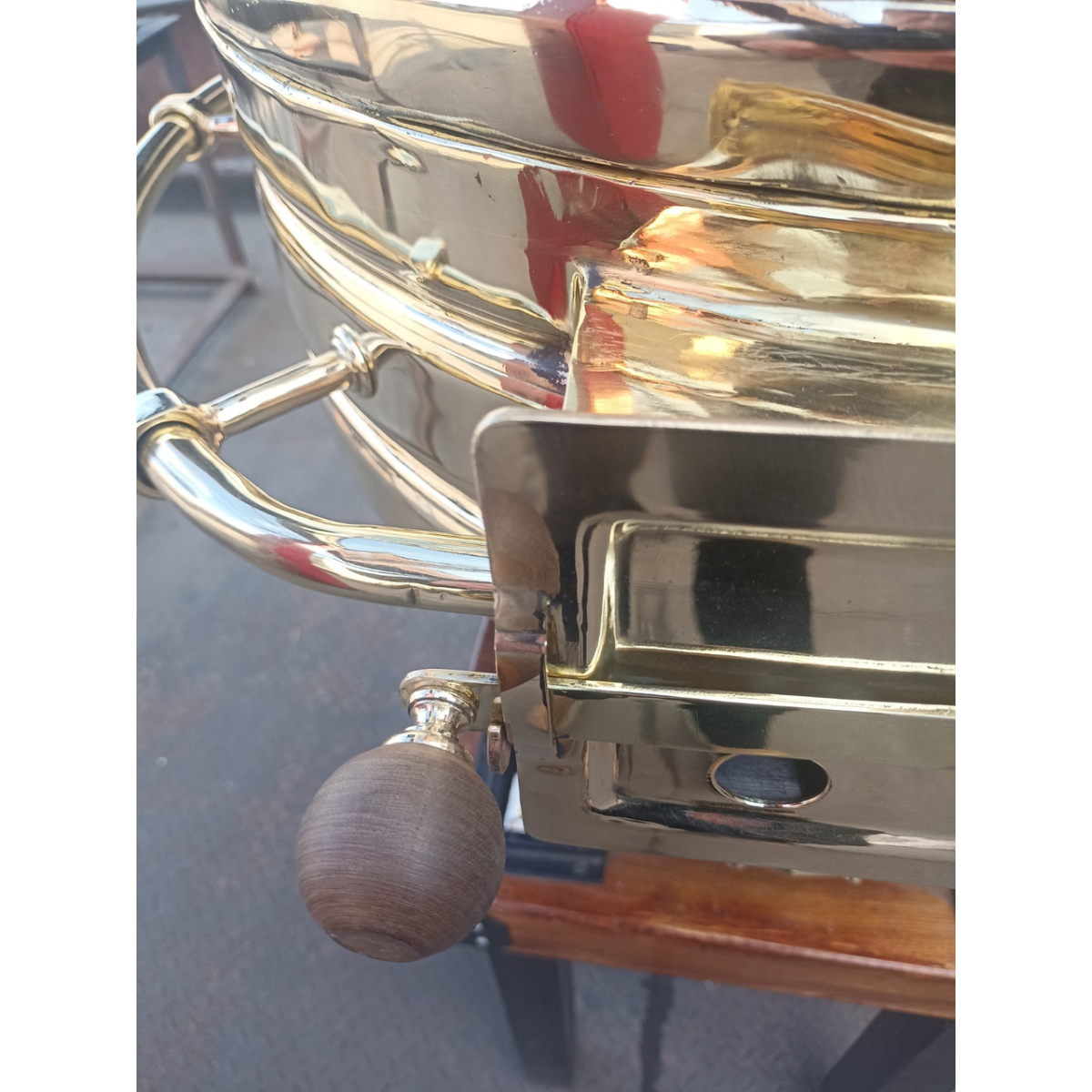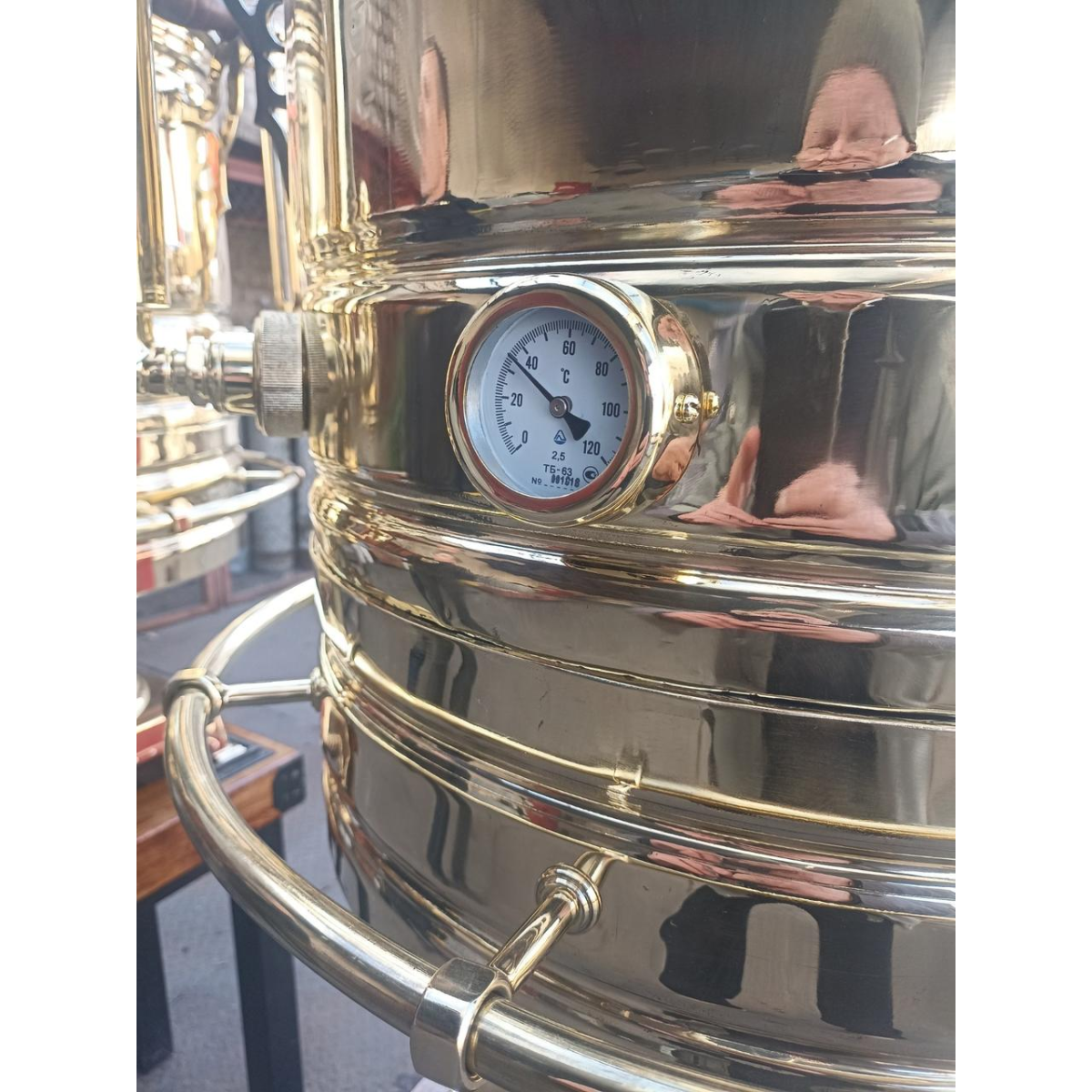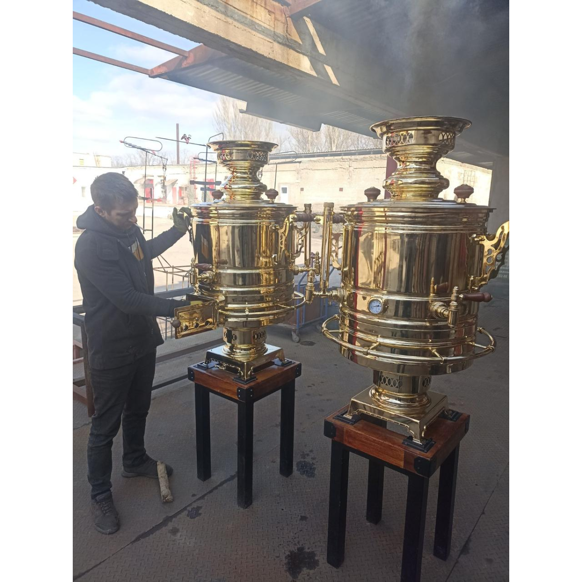 Конструктивно "Запорізький Самовар"-термос виготовлений зовні із золотої полірованої латуні, а внутрішня емкість, що заповнюється водою, - з харчової нержавіючої сталі. Всі декоративні елементи - ручки, крани, шильди, жетони і медалі, виконані з латуні.