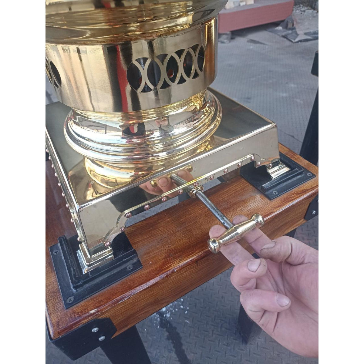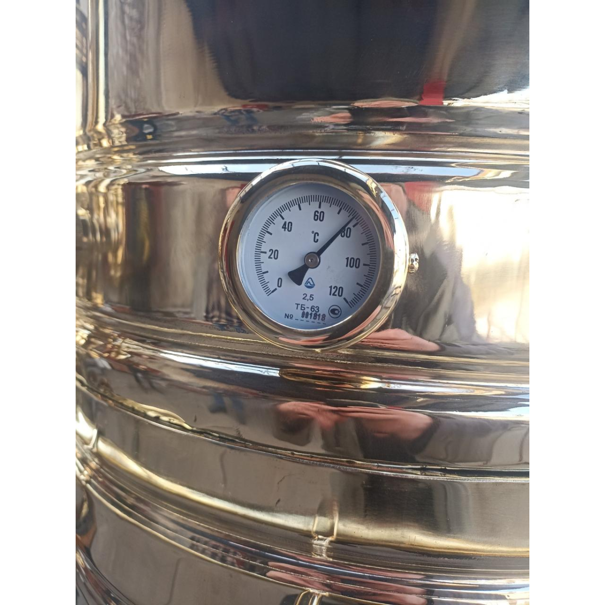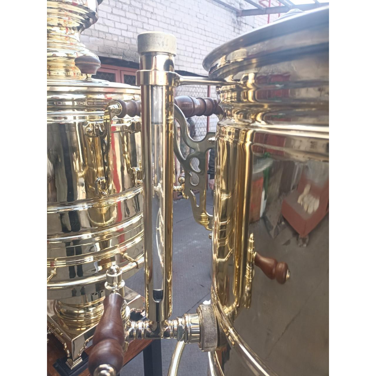 Конструктивно "Запорізький Самовар"-термос виготовлений зовні із золотої полірованої латуні, а внутрішня емкість, що заповнюється водою, - з харчової нержавіючої сталі. Всі декоративні елементи - ручки, крани, шильди, жетони і медалі, виконані з латуні.