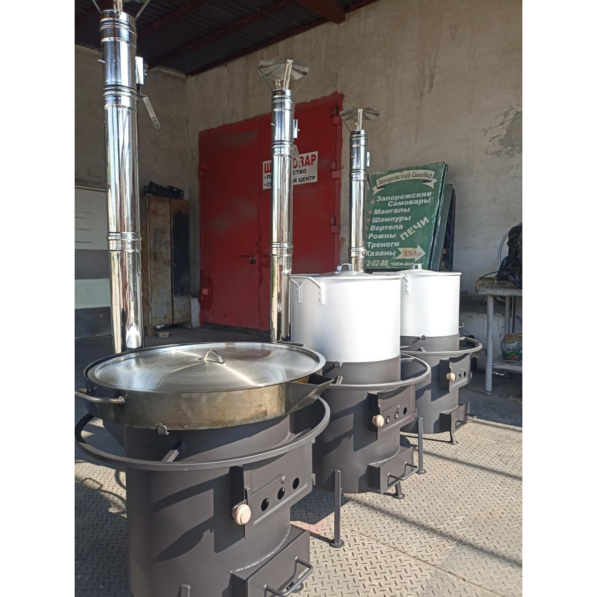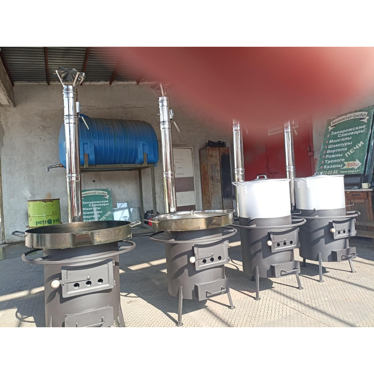 5. Запорізька піч ПВП-50 повної комплектації, поряд з котлом, оснащується також сковородою і лопаткою для масової видачі смажених страв. Запорізькі печі випускаються на заводі з 1998 р. у варіантах 50, 100, 200, 300, 500, 1000 л. Печі експлуатують підрозділи МВС, МНС, Нацгвардії України в найважчих умовах.